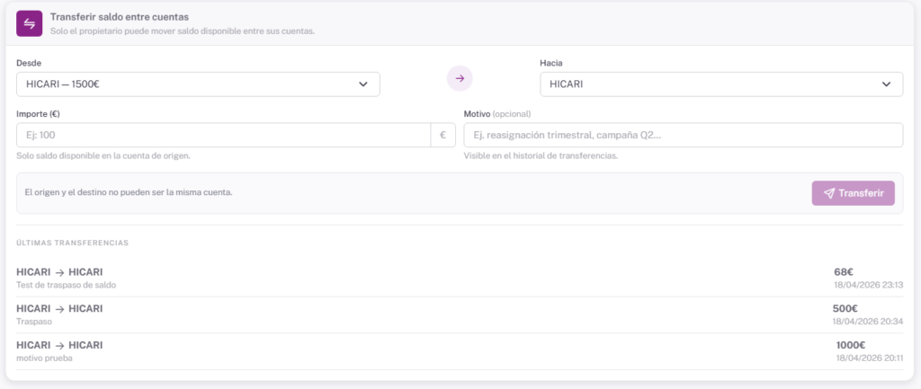Si gestionas varias marcas o proyectos, tienes la opción de mover saldo entre tus propias cuentas para reorganizar presupuestos cuando lo necesites. Cada transferencia queda registrada en un historial, para que puedas revisar en cualquier momento cómo se ha distribuido el presupuesto entre tus cuentas.