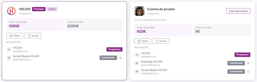 Tener varias cuentas es una forma profesional de organizar todas tus campañas sin mezclar marcas, clientes o presupuestos. Cada cuenta funciona como un espacio independiente donde puedes gestionar briefs, revisar entregas, invitar colaboradores y controlar el saldo de forma separada. Esto te permite trabajar con claridad, mantener el orden y evitar errores cuando manejas varios proyectos a la vez.