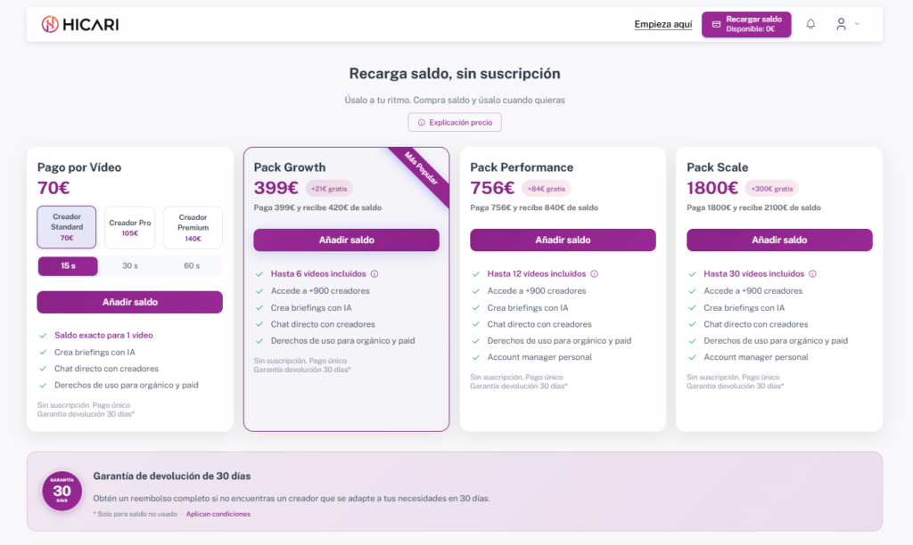 Nos adaptamos a tu presupuesto. Los packs en la plataforma son referencias, en HICARI nos adaptamos a tu presupuesto y hacemos recargas puntuales o recurrentes en base a tu budget concreot.